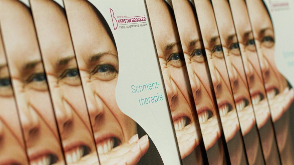Neben der digitalen Präsenz war es auch wichtig, ansprechende Printmaterialien zu erstellen. Hierzu habe ich verschiedene Flyer und Broschüren gestaltet, die über die Leistungen der Praxis informieren und gleichzeitig das Corporate Design widerspiegeln. Diese Materialien dienen nicht nur der Information, sondern auch der Akquise neuer Patientinnen und der Stärkung der Markenidentität.
